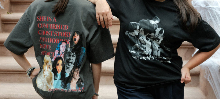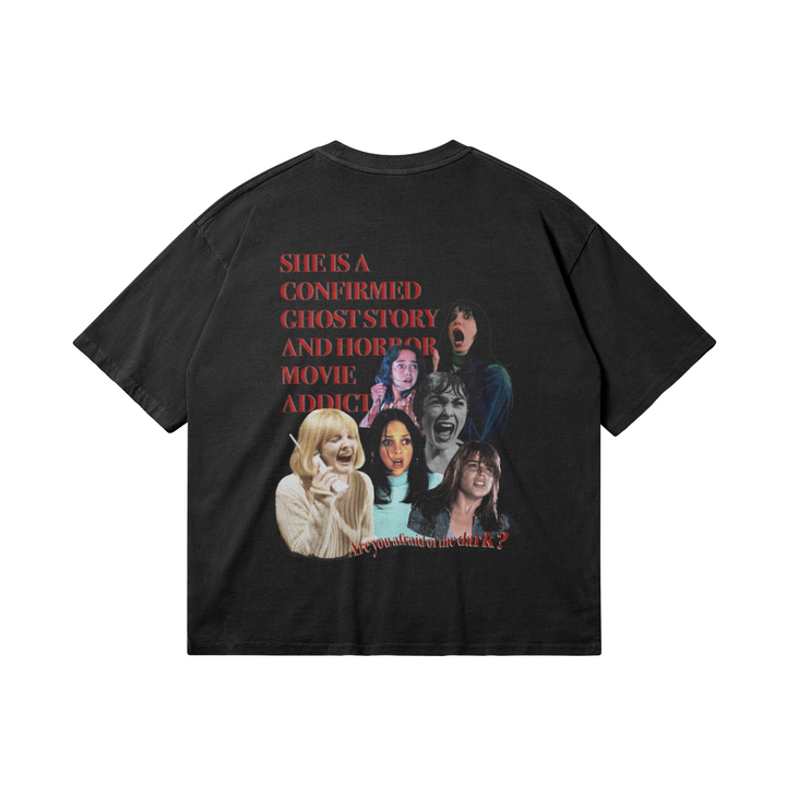 Washed dark gray unisex oversized t-shirt "She is a confirmed ghost story and horror movie addict".
