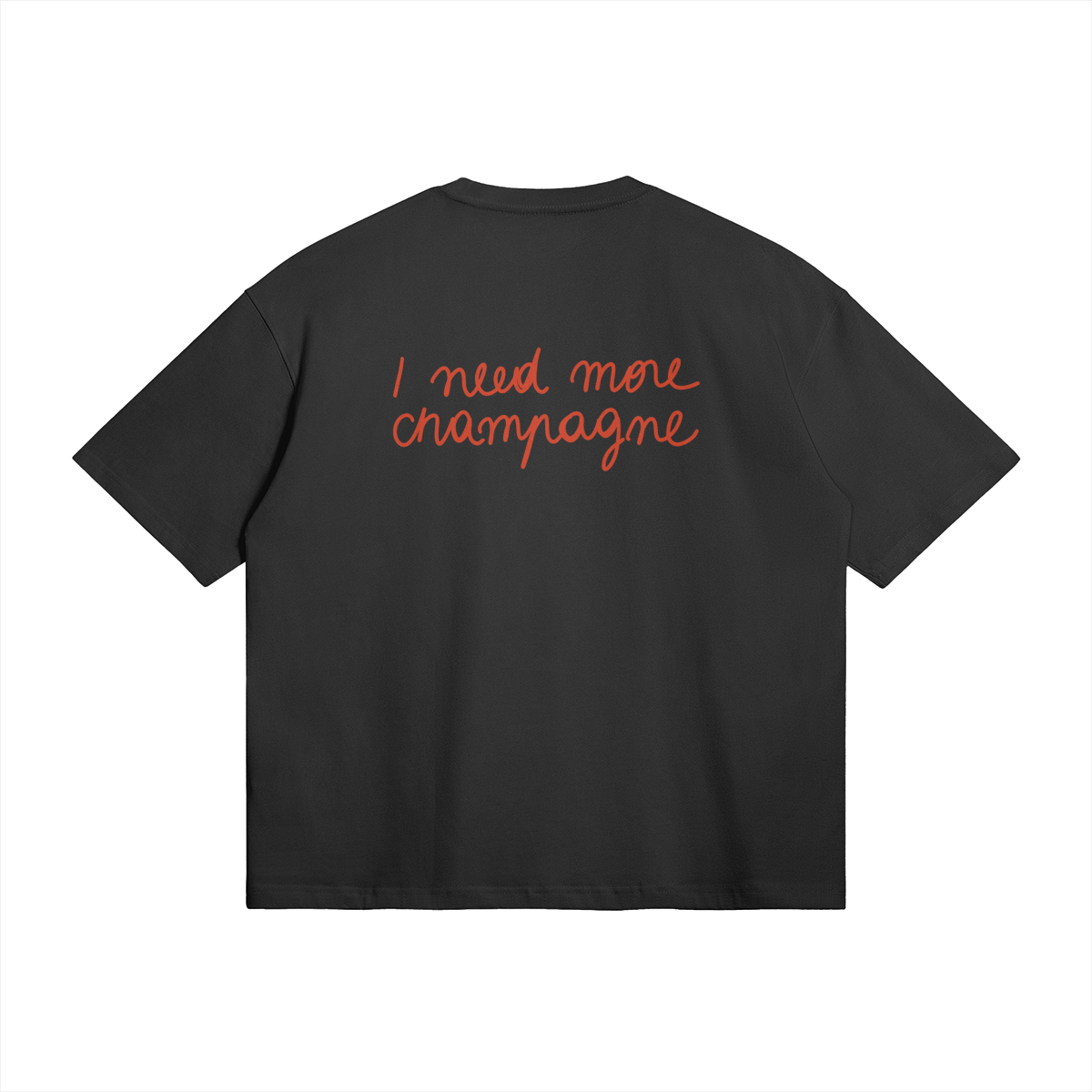 Black “I need more champagne” T-shirt with red writing.