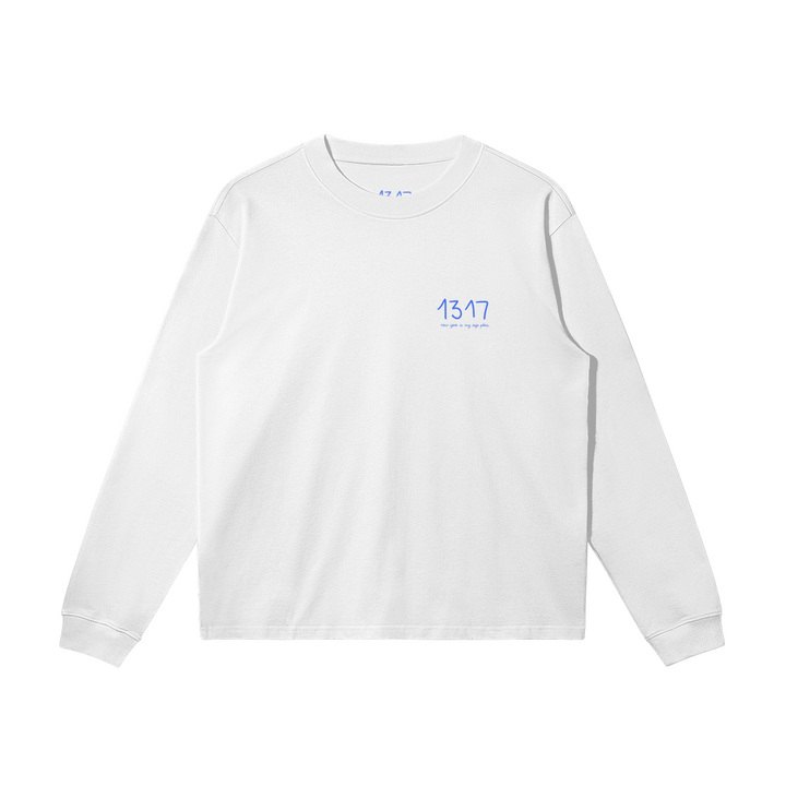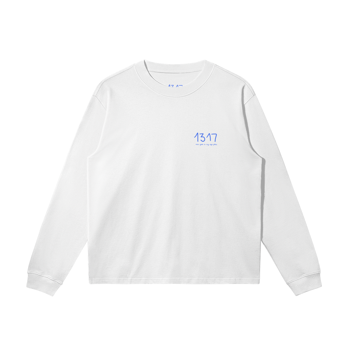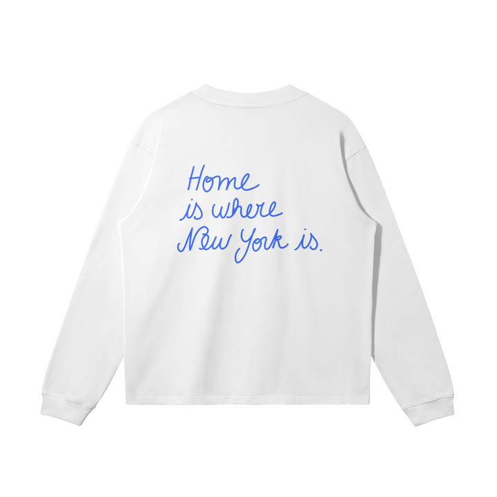 Oversized, unisex long-sleeved t-shirt "Home, is where New York is." in white and blue.