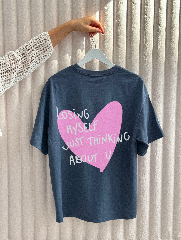 “Losing myself just thinking about u” gray/blue and pink t-shirt.