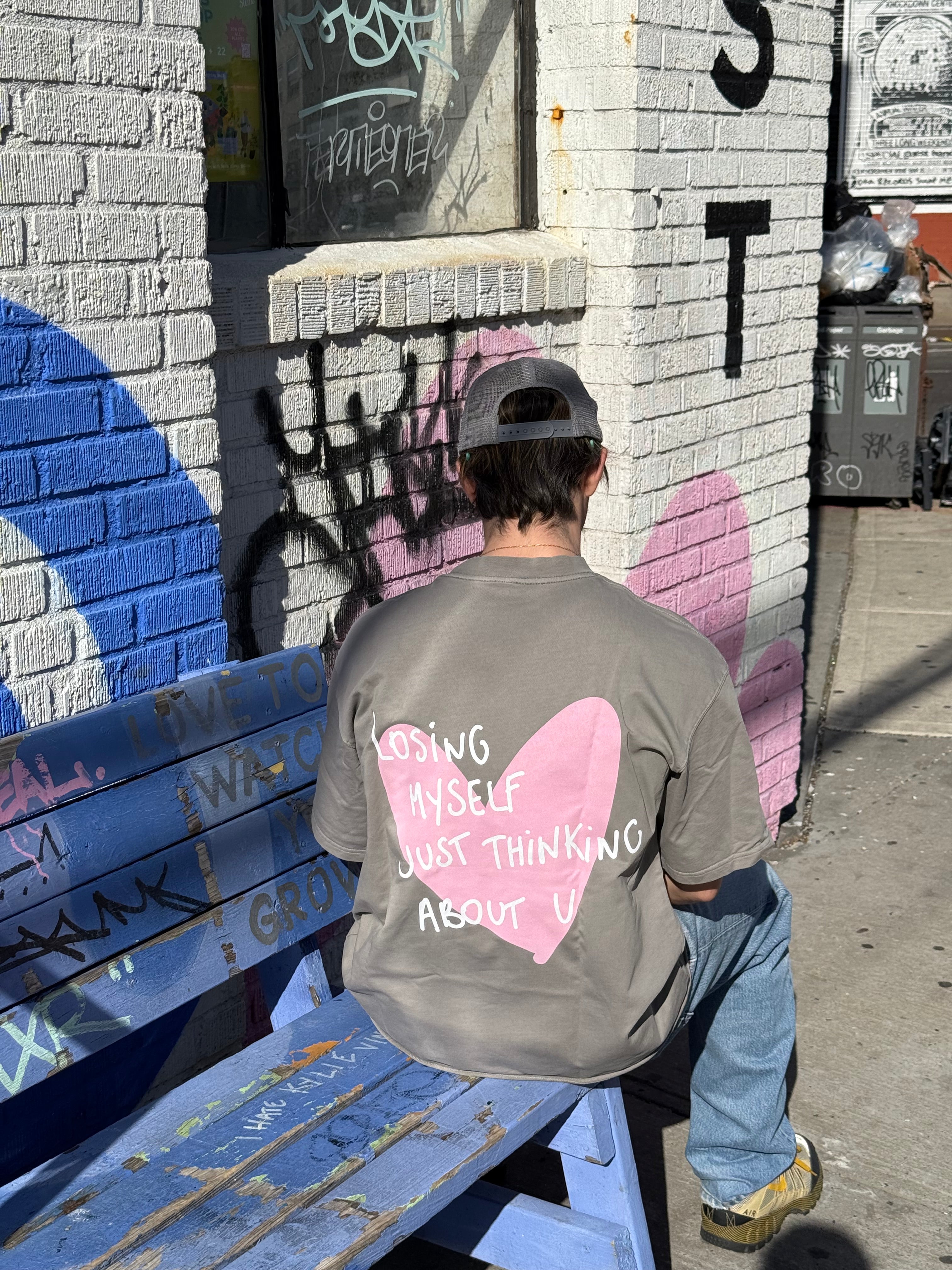 “Losing myself just thinking about u” t-shirt in faded gray and pink.