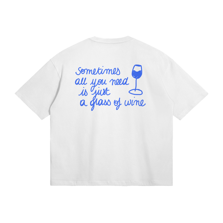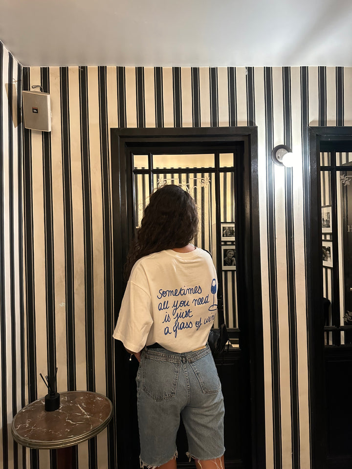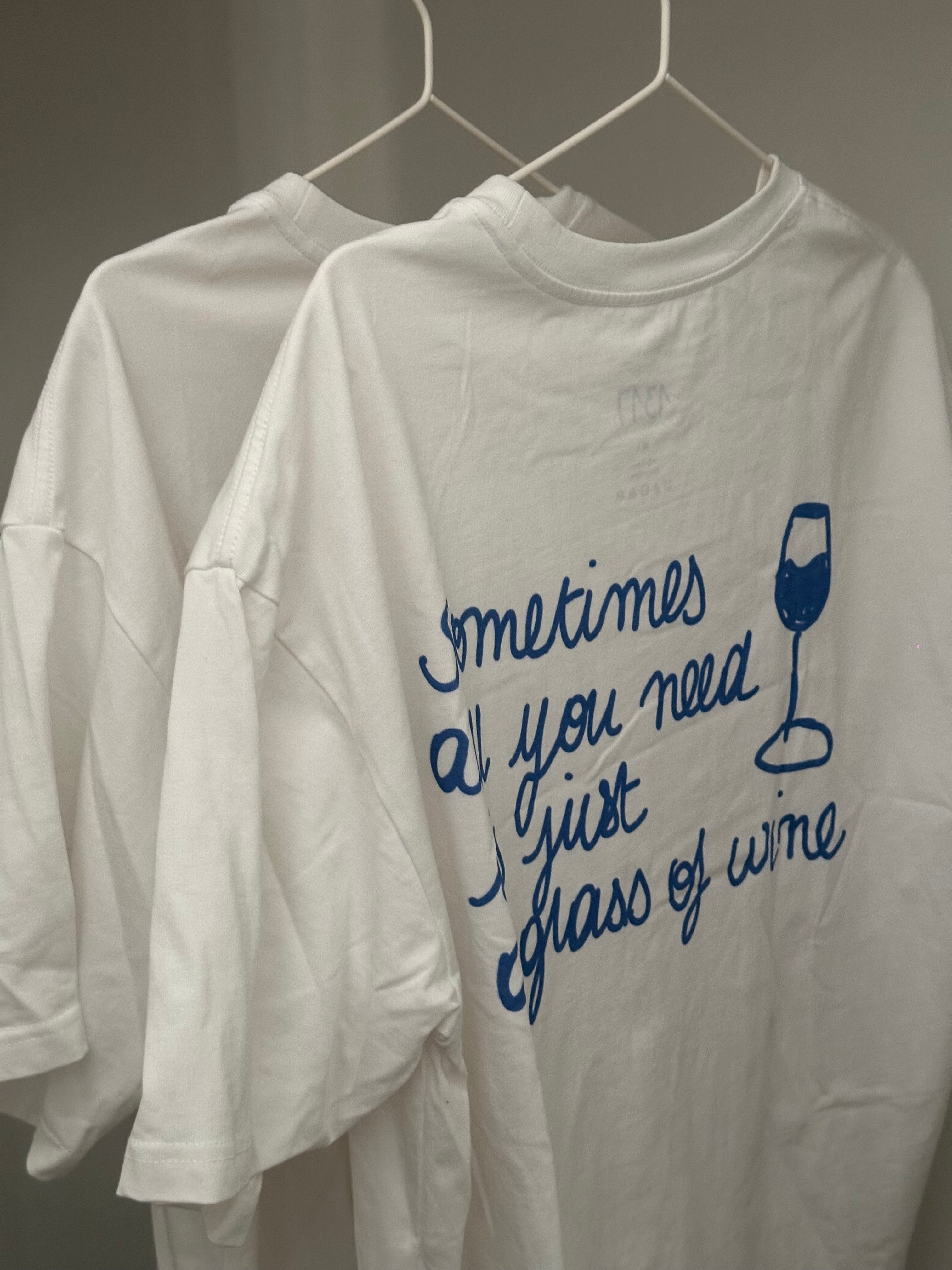 White and blue “sometimes all you need is a glass of wine” t-shirt.