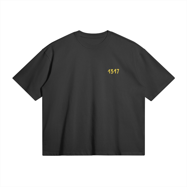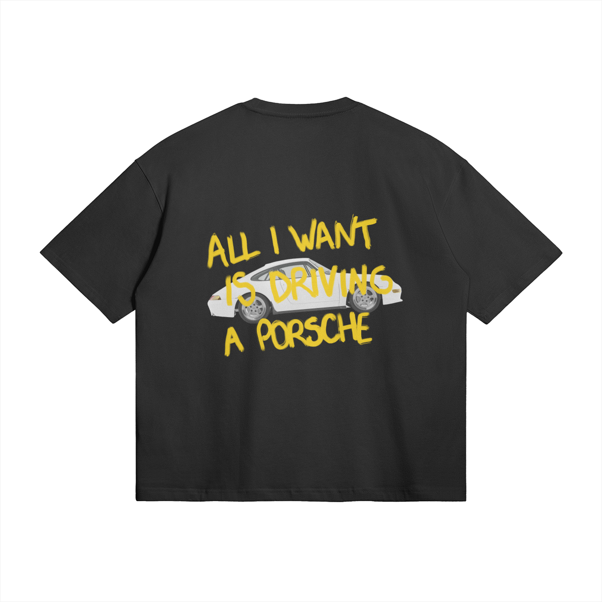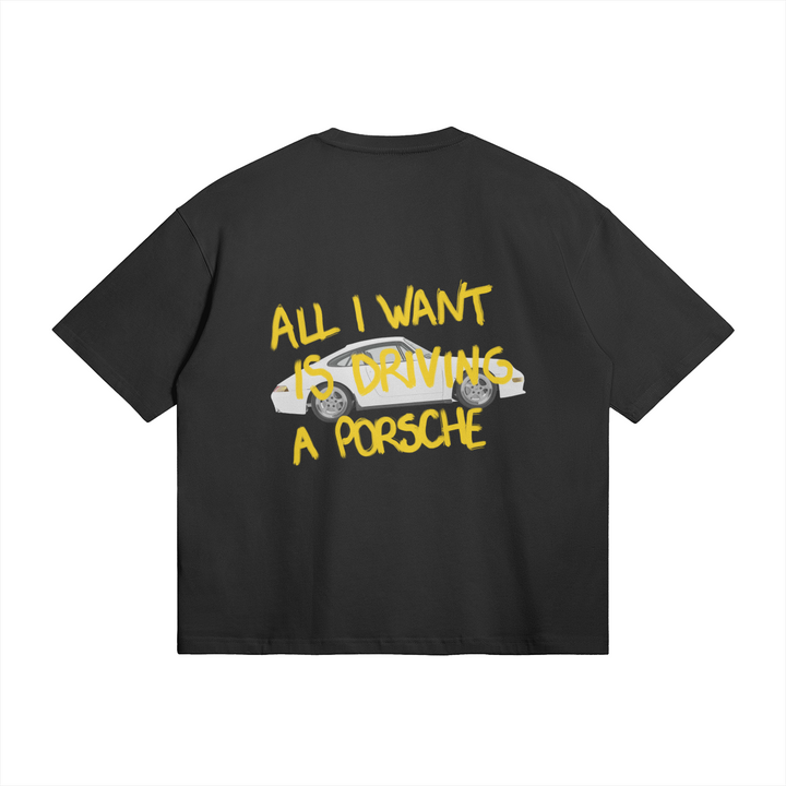 T-shirt "All I want is driving a Porsche" noir et jaune. Coupe oversize. Unisexe.