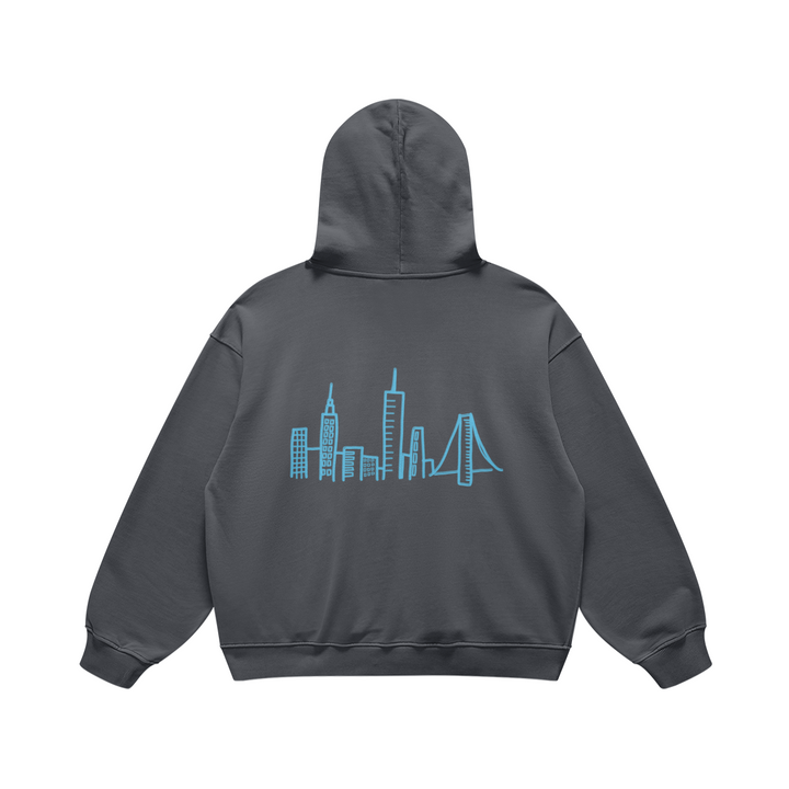 Sweat à capuche oversize et unisexe "currently in a relationship with new york" gris et turquoise.