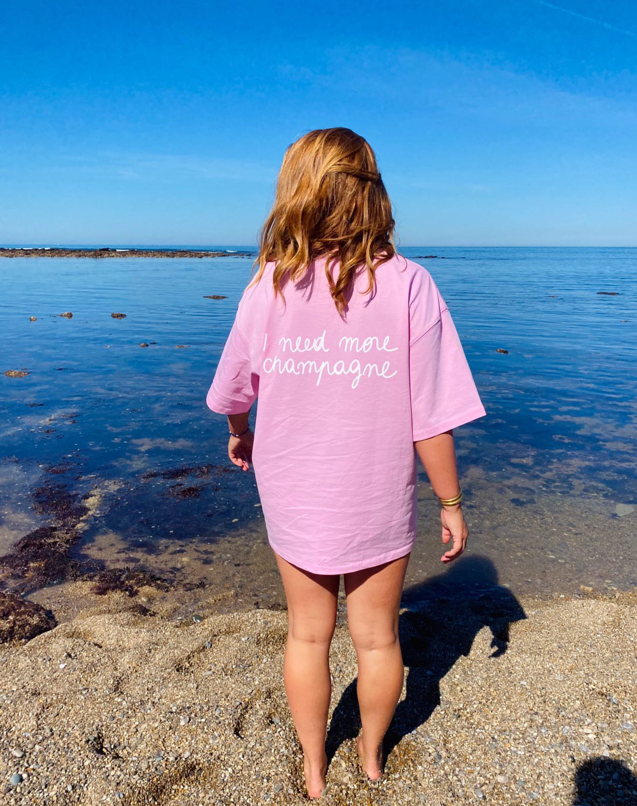 T-shirt « I need more champagne » rose écriture couleur blanche.