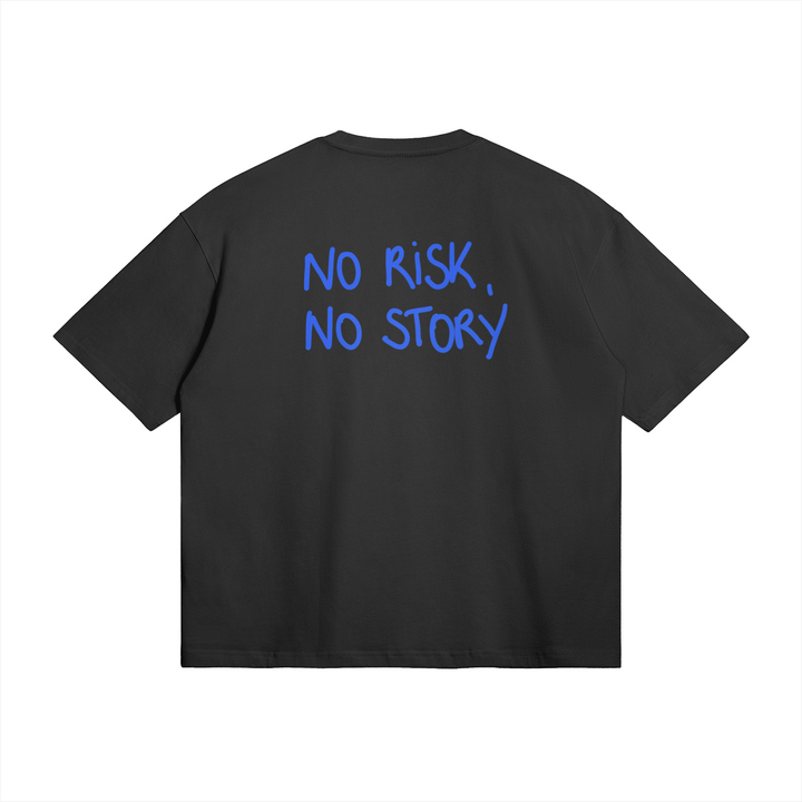 T-shirt « no risk, no story » noir écriture couleur bleue.