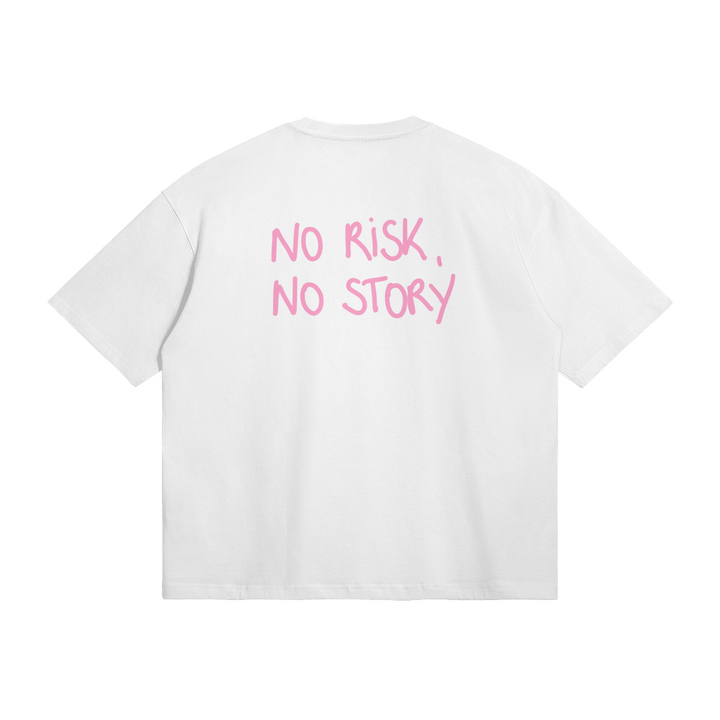 T-shirt « no risk, no story » blanc écriture couleur rose.