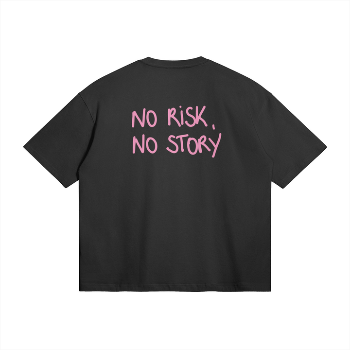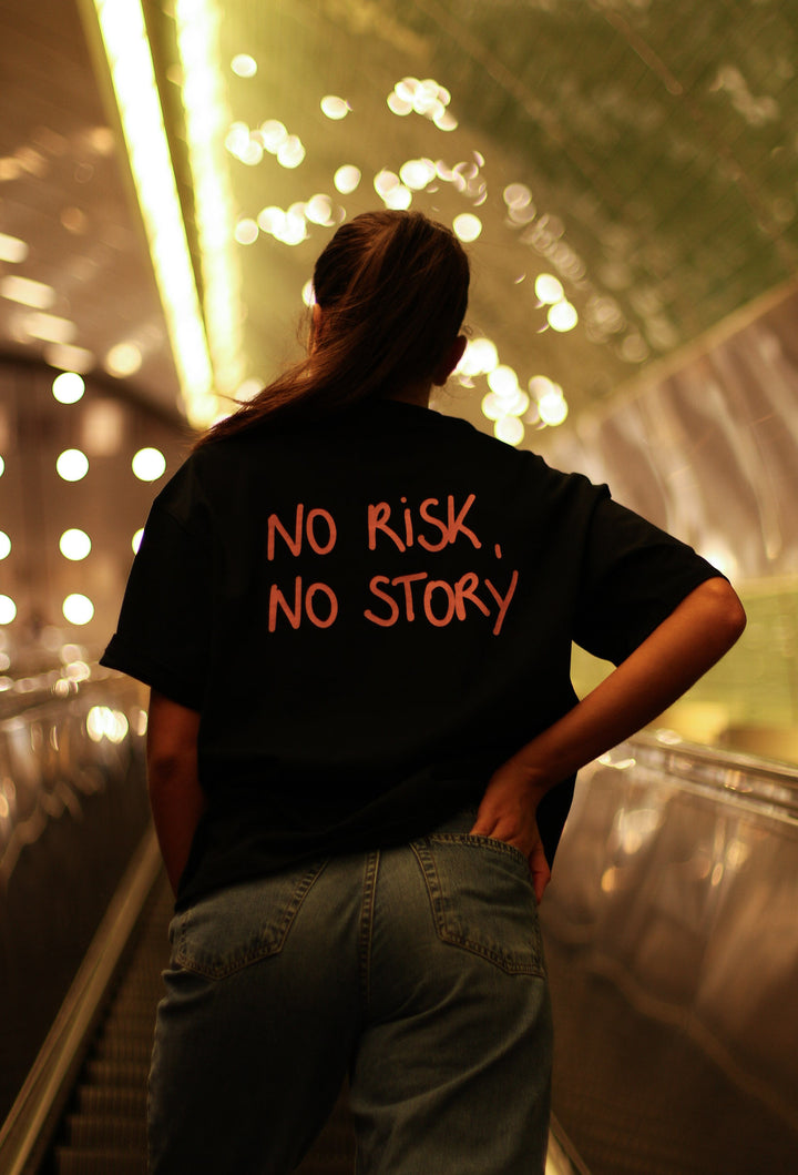 T-shirt « no risk, no story » noir écriture couleur rose.